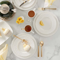 Blossom lane is our new white, patterned dinnerware collection. we took the iconic kate spade new york logo and created something new with this beautiful pattern of florals. This is the perfect design with a little flair. the carved spade flower detail gives it a mod feel that we love. This collection gives your table with a fresh finish that can go well with almost anything!