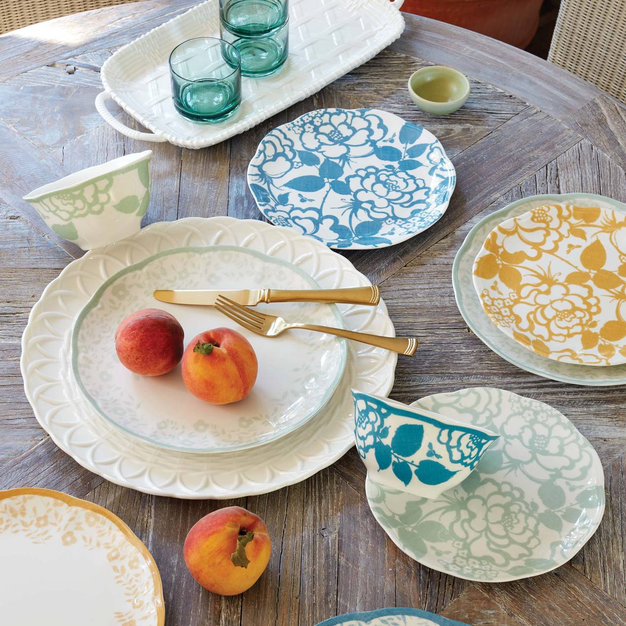 Inspired by the cottagecore trend of peace and simplicity, this fresh new take on our #1 Butterfly Meadow pattern is the perfect match to the grandmillenial aesthetic. Lush florals bloom along the scalloped edges, while tiny butterflies pop around the pattern for a charming effect. Sage, saffron, cornflower and goldenrod colors add a blissful touch that mix and match beautifully with other Butterfly Meadow pieces in your collection. Made from quality porcelain that’s both dishwasher and microwave safe, it’s a lovely pattern that recaptures the warmth of your Grandmother’s vintage style.