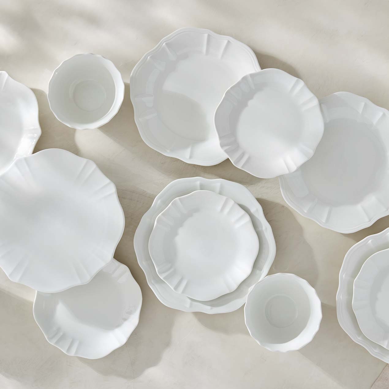 Bring home the quiet elegance of Eldridge, white porcelain dinnerware inspired by gracious living. With its romantic curves and carved details, it's a lovely complement to family recipes passed down through generations and the kind of hospitality that never goes out of style. Eldridge is southern charm, served daily.
