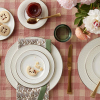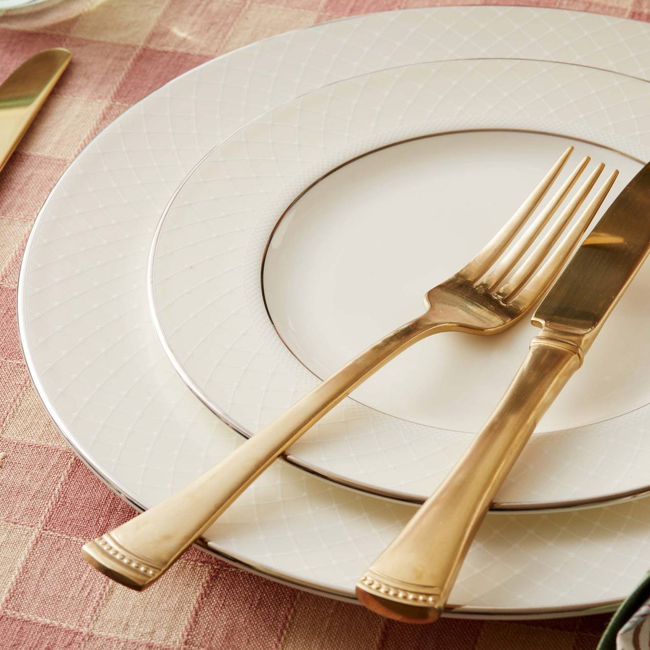 A design reminiscent of fine lace, accented with platinum, decorates each piece in this collection. The subtle pattern gives any table an easy elegance, making it perfect for special gatherings or for elevating everyday dining. Venetian Lace is also available in gold, with beautiful lattice and floral motifs. This collection is crafted of durable white bone china and is chip resistant and dishwasher safe.
