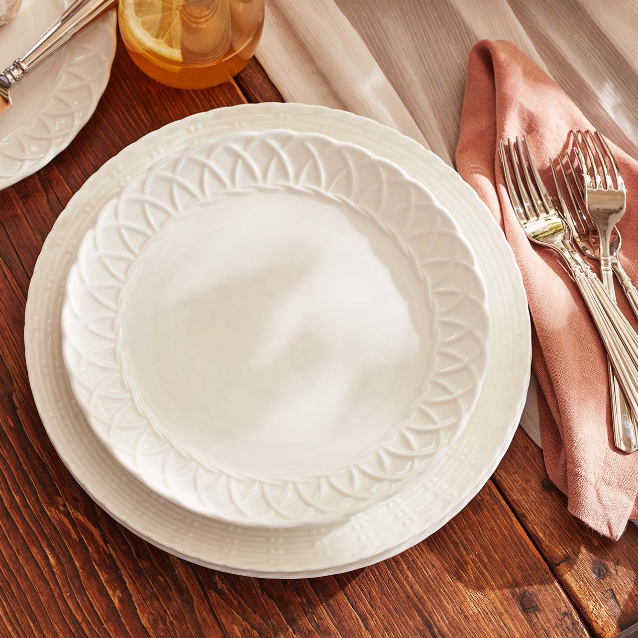 Bring a timeless element to your table with Wicker Creek. This cleverly textured set is right at home with warm breezes and smiling faces around the table. Each piece appears as a preserved, iconic symbol of summer with its woven wicker texture. Featuring dinnerware crafted of bright white bone china, plus durable porcelain serveware and giftware. Mix and match for the freshest tablescapes.
