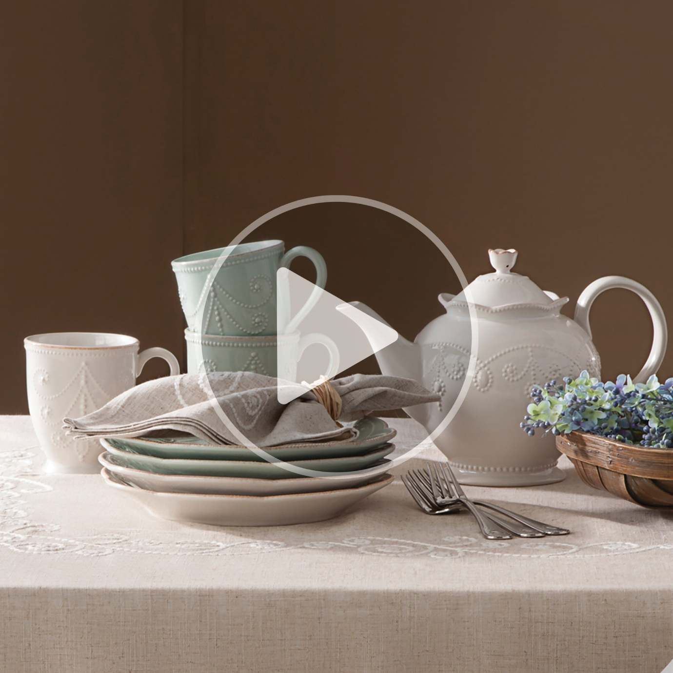ruffles in a clean, elegant motif. Each piece has its own unique scallop pattern accented with our signature, teastained rim. Mix any of these white stoneware styles with our other French Perle collections, like Classic, Groove and Bead for distinct café charm. Bon appétit!